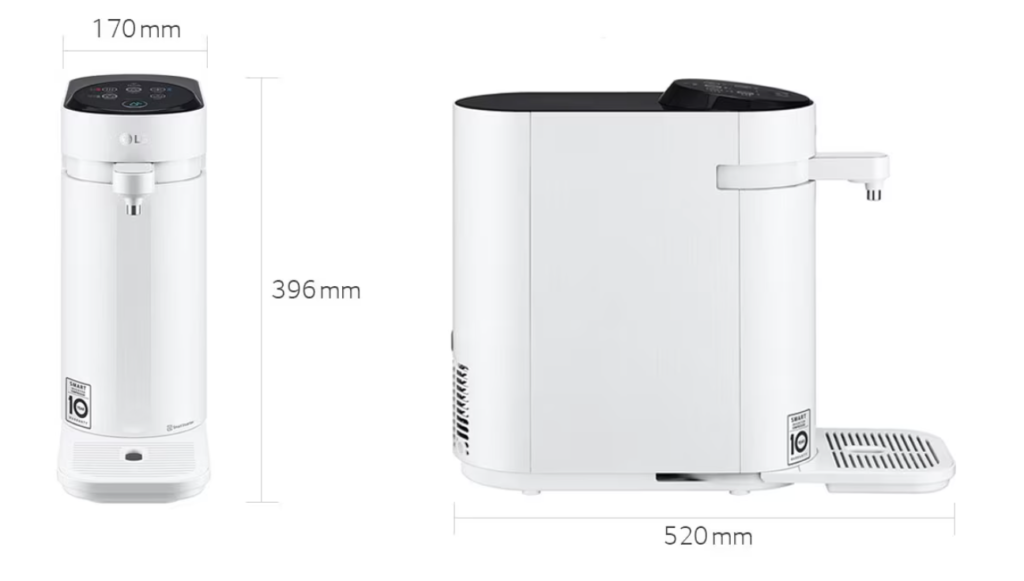 • Convenience: Ergonomic Touch Display, Volume Control, Hot Water Control, Filter Change Alert, LG ThinQ™
